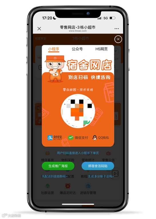 系统为你的网店生成专属网店码,把它贴在各个宿舍门背后、教学楼公告栏,同学扫码就能直接进入网店下单,简单便捷,轻松拓展客源。