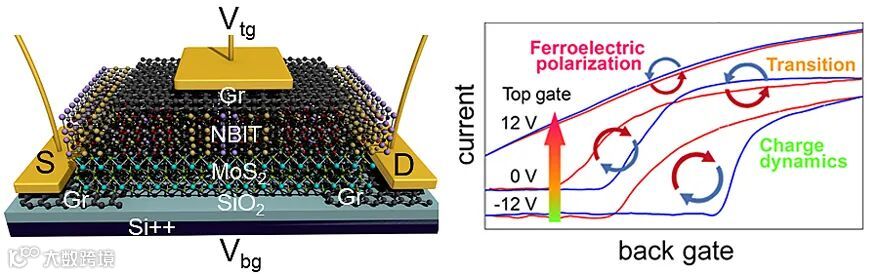 实验发现NBIT中存在由氧空位造成了电荷陷阱,对二硫化钼沟道造成与铁电相反的逆时针滞回,且在100°C高温下依然保持稳定,可以实现短程储存功能。通过双栅耦合,文中实现了栅介电层NBIT中陷阱电荷和铁电性对于二硫化钼沟道调控的可控转换。基于这项发现,未来通过进一步优化材料和器件结构,有望实现同时具有短程和长程记忆的新型多功能存储器件。