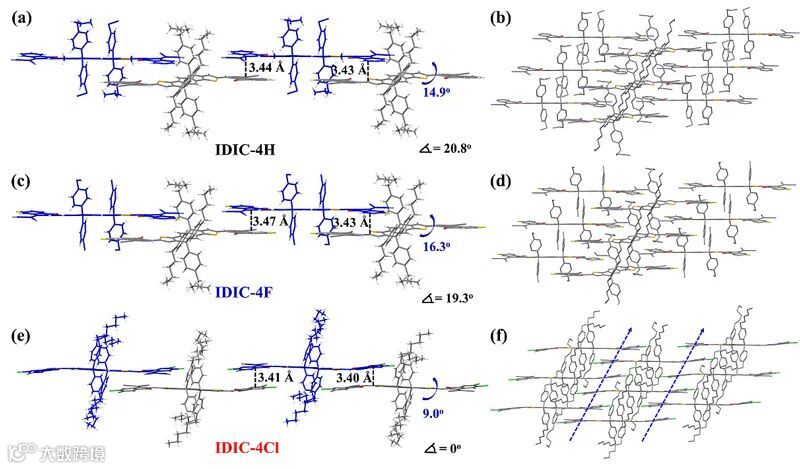 图1. 不同卤素取代的单晶堆积排列 (ACS Appl. Mater. Interfaces., 2018, 10, 39992)