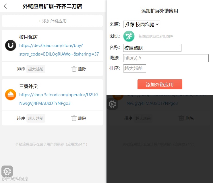 1.盒子、零售、批发店外链扩展,新增优店、跑腿、三餐外卖列表外链应用选项。
