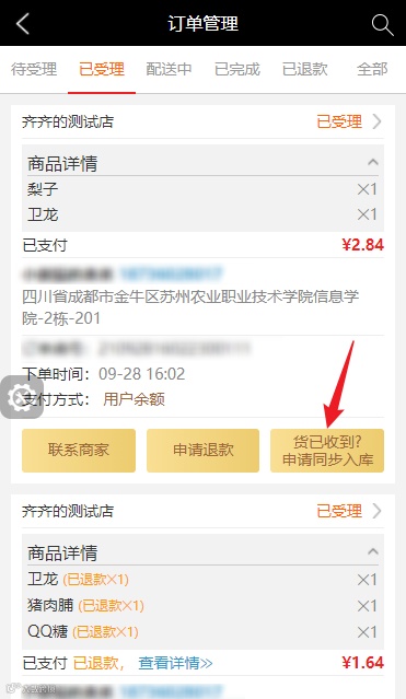 1.盒子采购店-用户端管理页,已受理状态下的订单新增提醒发货按钮。
