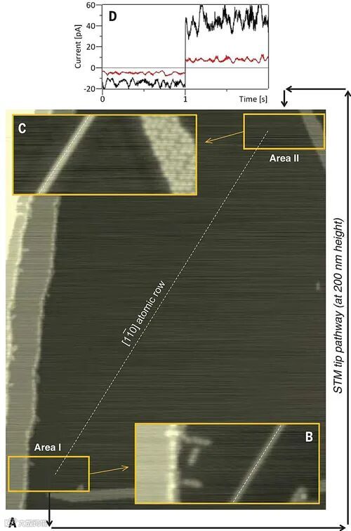 )时,在STM图像中会显示出一条贯穿整个图像的直线(如下图D,以下称“直线”),有意思的是,当他们继续扫描相邻区域(下图D上方或下方区域),这条直线依然存在而且方向丝毫没有改变。这引起了研究者的好奇,这条直线怎么产生的?为什么同样条件下其他取向的分子保持几乎静止的状态(下图C、D)?