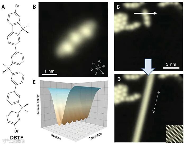 Leonhard Grill课题组最初设计DBTF这个分子(下图A),是为了在金属表面上生长分子线(Science, 2009, 323, 1193–1197)。在使用STM操纵技术研究平坦Ag(111)表面上分子取向对其扩散性能的影响时,他们意外发现,当DBTF分子在Ag(111)表面上旋转至某一特殊取向(