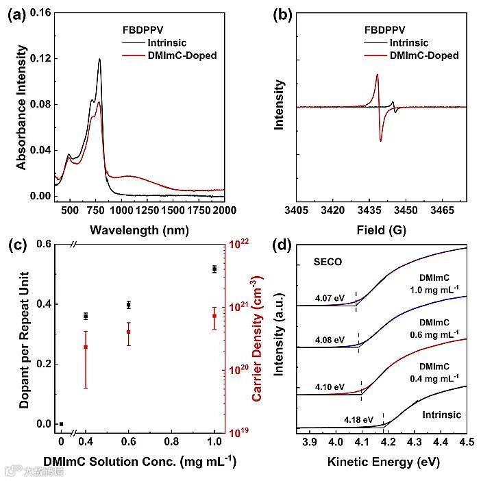 选用具有高电子迁移率的n型半导体聚合物FBDPPV作为掺杂受体,采用旋涂法(在预先制备的FBDPPV薄膜上再旋涂掺杂剂DMImC)制备掺杂薄膜并用于随后的表征。在经热退火后,薄膜在吸收光谱中1100 nm处极化子吸收峰及电子顺磁共振(EPR)中g = 2.0039处强自由基信号的出现,表明经热退火后DMImC能有效地掺杂FBDPPV并生成具有顺磁信号的极化子。通过改变旋涂时DMImC溶液的浓度可有效控制聚合物薄膜中DMImC的含量,并实现对薄膜掺杂程度的调控,即薄膜中更高的掺杂剂含量可显著提升其载流子浓度和费米能级。总之,经热退火后DMImC可实现对FBDPPV的高效、可控n型掺杂。