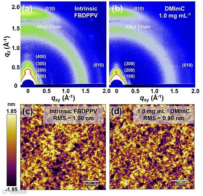 掺杂薄膜中掺杂剂的加入对薄膜微观形貌的破坏是限制其电学性能提升的主要因素之一。作者采用掠入射X射线衍射(GIWAXS)和原子力显微镜(AFM)详细探究了掺杂剂DMImC的引入对FBDPPV薄膜微观形貌和表面形貌的影响。随薄膜中掺杂剂含量的逐渐增加,掺杂的FBDPPV薄膜依然表现出清晰的对应于层状相堆积的(100)、(200)、(300)衍射和对应于π-π堆积的(010)衍射。DMImC的加入并未明显影响聚合物的π-π堆积距离,使掺杂的聚合物薄膜依然保持高效的链间电荷传输。此外,掺杂薄膜依然保持均一的形貌,并未出现相分离,证明DMImC与聚合物间存在良好的混溶性,保证体系获得较高的掺杂效率。因此,未改变的π-π堆积距离及良好的混溶性使掺杂的聚合物薄膜表现出优异的热电性能。