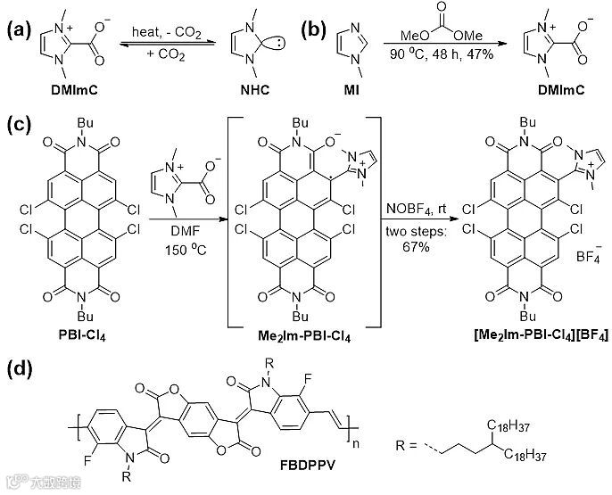 Scheme 1. a) Decarboxylation of DMImC to NHC and b) the synthetic approach to DMImC. c) The reaction between PBI-Cl4 and DMImC under heating. A delocalized PBI-centered radical anion was yielded, in which the cationic imidazolium was introduced in the bay position of PBI-Cl4. d) Chemical structure of polymer FBDPPV.