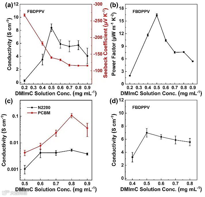 Figure 2. Thermoelectric performance characterization. a) Electrical conductivity, Seebeck coefficient and b) power factor of doped FBDPPV with various DMImC concentrations. c) Conductivities of doped N2200 and PCBM with various DMImC concentrations. d) Conductivities of doped FBDPPV films sequentially deposited with DMImC in air.