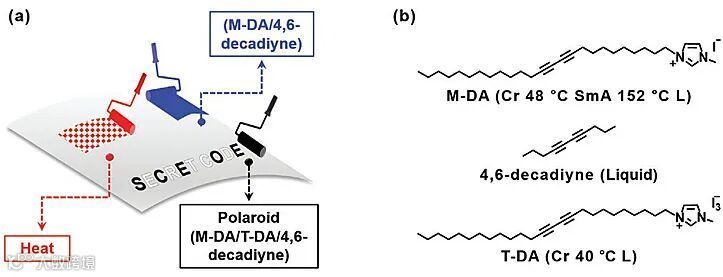 M-DA/T-DA/4,6-癸二炔体系温敏性信息存储应用。图片来源:Adv. Mater.