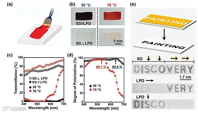 此外,基于机械剪切力诱导制备的复合膜体系具有单轴取向结构,基于分子结构排列不同、薄膜在不同偏振方向上呈现不同的显色。这一特性使得膜材料体系能够应用于加密信息存储;通过不同轴向的取向诱导处理,在不同偏振镜片观察下可分别观察到具有水平取向或垂直取向的写入信息。