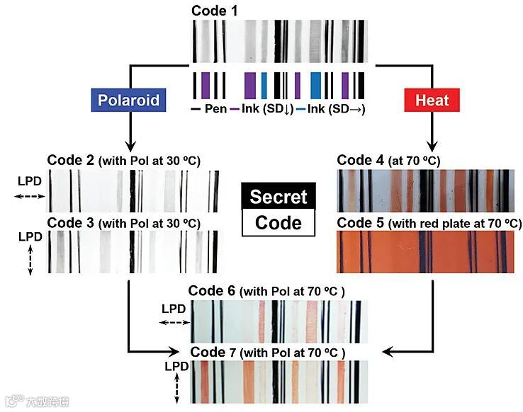 研究团队将该“秘密墨水”体系用于加密数据存储应用。采用DA墨水构筑两种不同类型的线条信息,在不同偏振镜片下观察、温度诱导刺激以及两者的复合模式下,膜材料分别可逆呈现不同的可读取信息(密码1-密码7)。