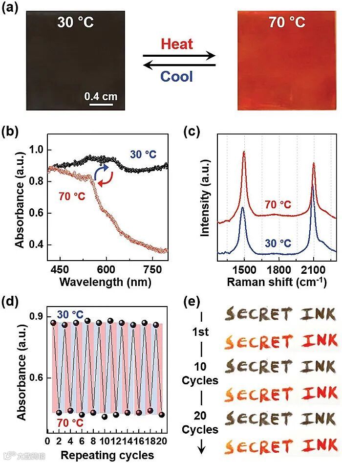 韩国研究团队通过咪唑鎓盐功能化二乙炔“秘密墨水”体系可逆的颜色、透明度变化,结合简单刮涂、自组装、光聚合构建了高性能保密信息存储体系。基于这种智能“秘密墨水”体系颜色、透明度变化对温度及偏振轴的依赖性,他们实现了双重加密模式,让该体系在复杂保密信息存储方面展现出极大的应用前景。