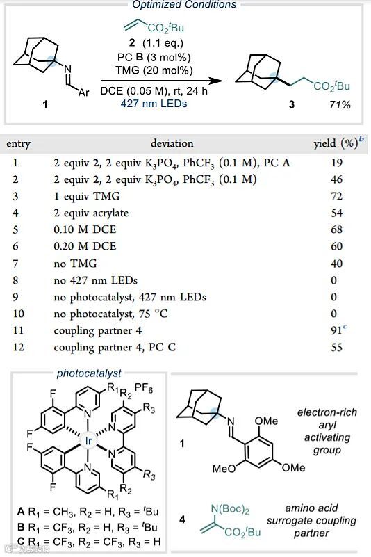 首先,作者选择金刚烷基胺作为模板底物,通过筛选各种醛活化基来探索亚胺的氧化潜力,结果发现2,4,6-三甲氧基苯甲醛的效果最好,以19%的收率得到了所需的产物(entry 1)。当使用氧化性更强的光催化剂([Ir(dF-CF3ppy)2(dtbbpy)PF6],PC B)时,反应收率有所提高(46%)。当使用三氟甲苯和1,2-二氯乙烷作为溶剂时,两者的收率相近,但DCE能提高光催化剂的溶解度,因此选择DCE作为反应的溶剂,并且发现降低反应的浓度会使收率有所提高。此外,改用偶联试剂4可显著地提高收率(91%),并能够获得非天然的γ-季碳氨基酸。对照实验表明可见光和光催化剂对该反应至关重要,两者缺一不可。