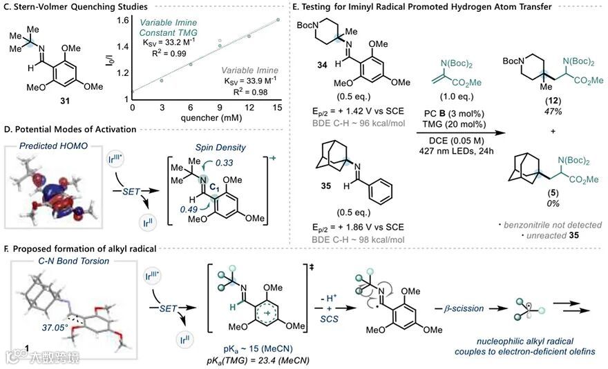 最后,作者对反应机理进行了研究,以确定C-N键活化和烷基自由基形成的方式(图4)。原位LED NMR监测表明该反应对亚胺和丙烯酸酯是一级相关(图4B),因此作者认为伯胺与醛缩合得到的亚胺(具有氧化还原活性)可以成功地淬灭PC B的激发态,事实上,Stern-Volmer淬灭实验证实了这一点(图4C)。接着经质子转移得到关键的亚胺自由基中间体,随后经β-断裂释放出烷基自由基,并与缺电子烯烃偶联,最后经还原和质子化得到所需的产物并再生PC B的基态。然而,亚胺自由基阳离子的自旋密度图显示亚胺氮和芳烃碳C1的自旋密度十分接近(图4D),因此作者设想了形成亚胺自由基的两种潜在途径:(1)氮自由基阳离子充当氢原子转移(HAT)试剂;(2)芳烃的氧化和随后酸化的亚胺的去质子化。为了证实潜在的HAT途径的可行性,作者在34和35之间进行了竞争实验(图4E)。结果显示亚胺35的氧化(Ep/2 = +1.86 V vs SCE)远远超出铱激发态的范围,但是当比较亚胺基C–H键的强度时,它与34很相似。因此,作者认为如果观察到5的形成,那么很可能是由34氮自由基阳离子产生的HAT引起的。事实上,反应仅检测到12以及剩余的35,因此作者认为要想发生C-N键活化,底物的氧化至关重要。于是,作者提出了一种机制,其中亚胺自由基阳离子上C1的自旋密度至关重要。1的晶体结构表明C-N双键并没有与芳环的π-体系完全共轭(图4F),导致亚胺的C-H键与芳环体系非共平面(out-of-plane)。通过计算确定本文中亚胺基C-H键的解离能并通过实验确定氧化电位(Ep/2 = 1.43 V vs SCE),估计出亚胺自由基阳离子的pKa约为15,且这种酸化程度很高的亚胺基C-H键很容易去质子化,并经自旋中心位移(spin-centered-shift)形成亚胺自由基,随后经β-断裂释放出烷基自由基以进一步与缺电子烯烃偶联。