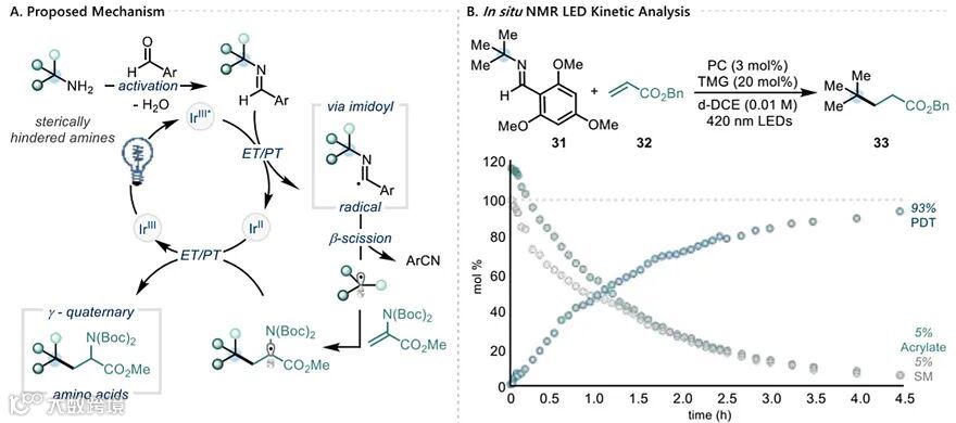 在此前研究基础上,美国哥伦比亚大学化学系的Tomislav Rovis教授课题组设想能否发展一种新型的方法来活化空间位阻较大的α-3°烷基胺。近日,他们报道了可见光催化的伯胺的脱氨烷基化反应。具体而言,在可见光的作用下,将位阻较大的α-3°烷基伯胺活化,然后与富电子的芳基醛进行缩合生成富电子的亚胺,后者经单电子氧化和去质子化生成关键的亚胺自由基(imidoyl radical)中间体。随后经β-断裂释放出烷基自由基,并与缺电子的烯烃进行偶联,从而生成了一系列非天然的γ-季碳氨基酸。相关成果发表在J. Am. Chem. Soc. 上。