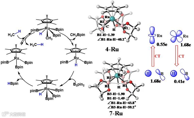 图2. 钌催化甲烷硼化反应的机理,关键中间体4-Ru和7-Ru的结构和其中关键的电子结构分析。图片来源:J. Am. Chem. Soc.