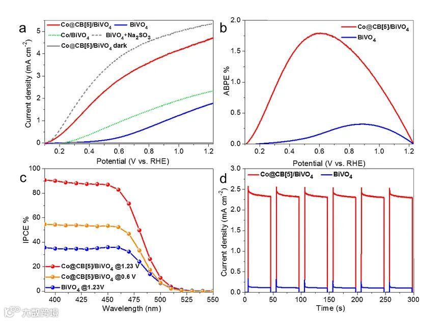 当Co@CB[5]吸附在多孔BiVO4型半导体表面时,Co@CB[5]/BiVO4光阳极在100 mW•cm-2(AM 1.5)的光照下,1.23 V(相对RHE)偏压下的光电流密度可以达到4.8 mA•cm-2,表现出的优异PEC性能可以与基于无机材料催化剂的BiVO4阳极媲美。动力学同位素效应(KIEs)、强度调制光电流谱(IMPS)等结果表面Co@CB[5]超分子水氧化催化剂能有效抑制BiVO4半导体表面电荷复合,同时加速电极表面电荷转移。