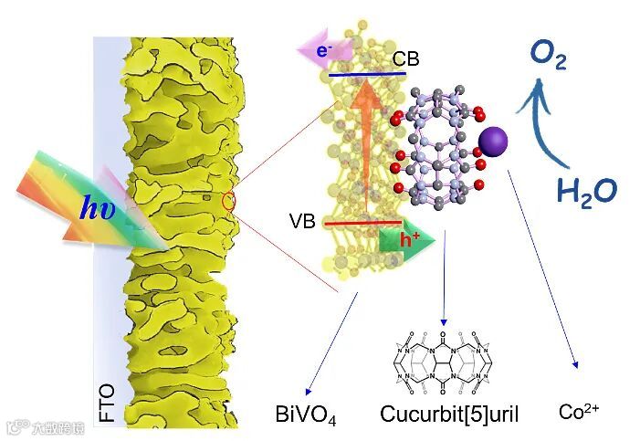 近日,大连理工大学孙立成院士、李福胜副研究员等人通过Co2+阳离子与Cucurbit[5]uril(葫芦[5]脲, CB[5])自组装制备了主客体配合物(Co@CB[5]),采用溶液浸泡方式将该超分子配合物催化剂吸附到多孔氧化铟锡(ITO)和多孔钒酸铋(BiVO4)半导体电极表面,并用于电催化和光电催化水氧化反应,器件取得了优异的水氧化性能。