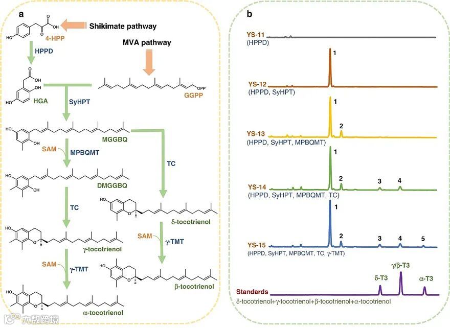 在该研究中,作者通过从光合生物中挖掘基因,筛选得到合成生育三烯酚的5个关键基因元件(图3),通过密码子优化和蛋白前导链的精准切除,在酿酒酵母中实现异源蛋白的功能性表达,并结合酿酒酵母内源的莽草酸途径和MVA途径,首次在非光合生物中实现终产物α-生育三烯酚的异源合成。进一步通过确定并解除合成途径的关键限速步骤、上游途径的综合优化、反馈抑制的解除、代谢平衡的重构等一系列工程菌株的系统改造,在摇瓶培养中总生育三烯酚产量达到7.6 mg/g 细胞干重。