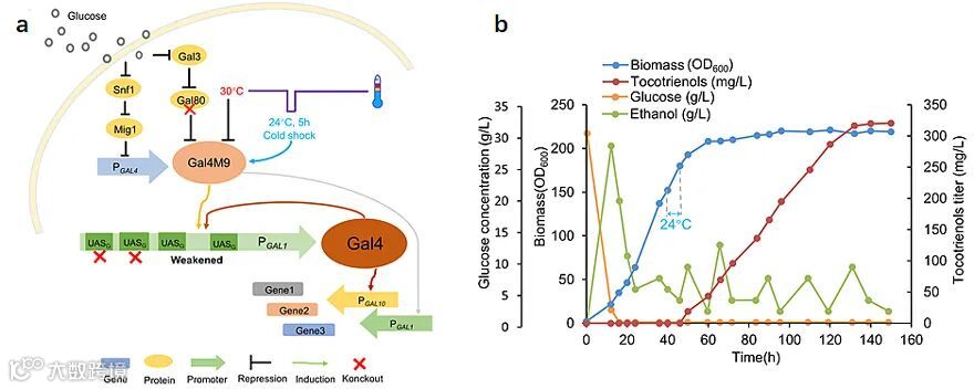 为了实现生育三烯酚的高密度发酵,作者基于课题组前期开发的Gal4温敏蛋白Gal4M9,开发了冷击启动的温度调控策略(图4)。利用温敏蛋白Gal4M9驱动野生型Gal4的表达,引入层级调控,以此弥补Gal4M9的活性损失,并可以根据途径需求定制转录激活蛋白Gal4的表达强度;采用该新设计的温控策略,只需若干个小时的冷击,即可触发打开产物合成的开关,实现细胞生长与产物合成的两阶段发酵,避免外源蛋白表达和产物积累对细胞生长的影响,从而大幅降低了工业发酵过程中的能耗成本,同时避免了长期低温对菌株生理代谢变缓的副作用。最终,在5 L发酵罐中总生育三烯酚产量达到320 mg/L。