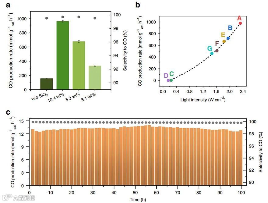 图1. (a) Ni12P5和不同担载量Ni12P5/SiO2在间歇式反应器中的催化性能。(b)不同中性密度和光谱截止滤光片下,反应速率-光强曲线。(c) 连续式反应器中,100 小时持续光照下的催化剂稳定性测试。