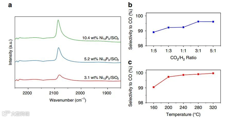 图2. (a)不同担载量Ni12P5/SiO2的DRIFT曲线。(b) 不同CO2/H2起始浓度下的反应选择性变化曲线。(c) 不同温度下,反应选择性变化曲线。