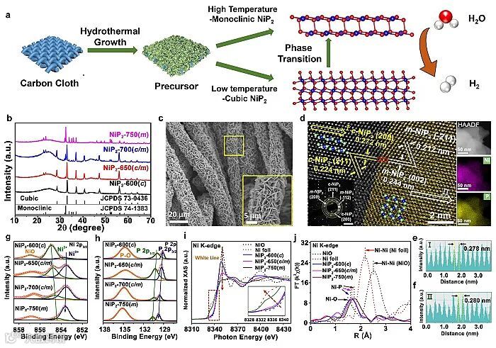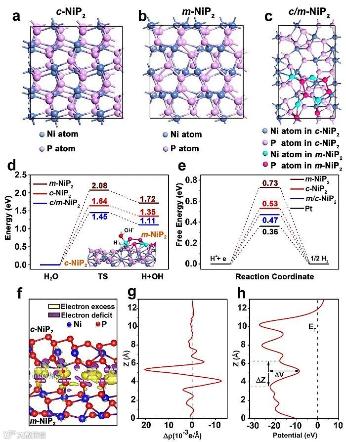 DFT计算结果显示(图2),c-NiP2与m-NiP2构成异质结时,将会对NiP2产生以下几点影响:首先,相结处水分子的解离能力将会得到提升,这会为后续步骤提供充足的H+。其次在相结处的氢吸附吉布斯自由能将会得到优化,更有利于HER反应的发生。另外相结形成后,电子将会趋向于有m相向c相迁移,从而使得界面处的电子重新排布,并在c相的Ni位富集,为H+的还原过程提供充足的电子。理论计算的结果很好的预测了相结可能起到的关键作用,为后续实验提供理论支持。
