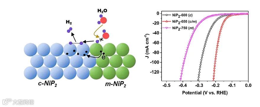 近日,哈尔滨工业大学宋波教授等人提出,利用某些催化材料具有多种晶相的特点,通过构筑“相结”来进一步提升其催化活性。NiP2作为一种常见的电催化剂材料,在以往的研究过程中,大多以元素掺杂和构筑异质结的手段,来提升其碱性HER活性。目前报道的性能较高的NiP2电催化剂均为立方相(Cubic,c相)NiP2,而实际上除了c相NiP2以外,还存在一种单斜相(Monoclinic,m相)NiP2。与金属性的c相相比,m相呈现半导体特性,研究人员预测,将两种不同晶相的NiP2整合在一起,构筑出NiP2异相结,利用二者能级结构的差异,有可能会促使电子发生定向移动,在相结界面处发生富集,从而优化电子结构,促进HER反应的发生。基于以上考虑,课题组提出通过构筑c/m-NiP2异相结的思路来提升NiP2体系的碱性HER性能(图1)。