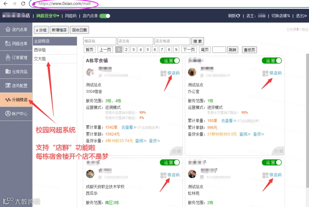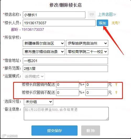 进入网超系统,点击【分销楼店】-【新增楼店】,运营主填充楼店名称、楼长信息即可;如电话、配送范围、学校、宿舍地址及服务范围等。