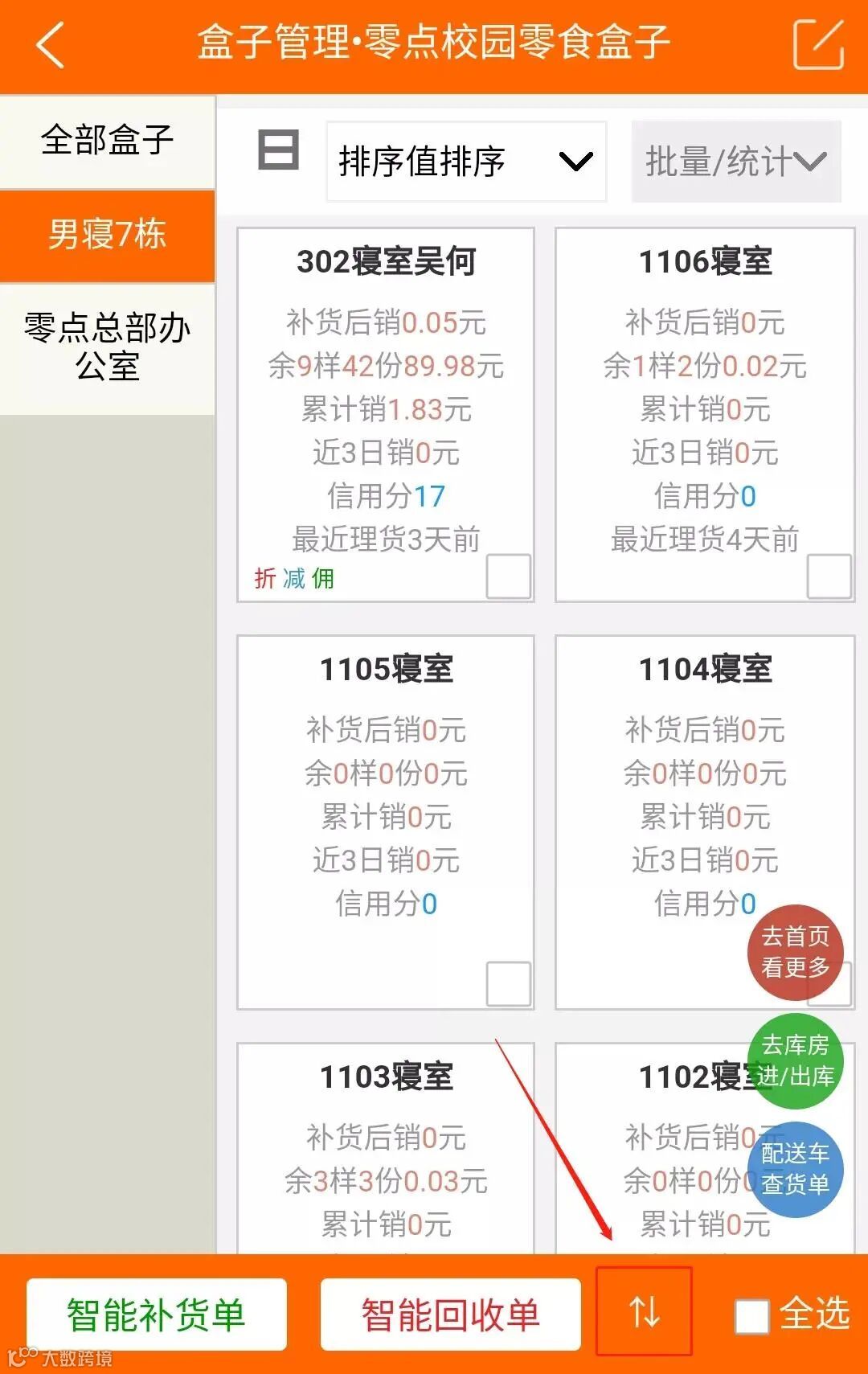 仔仔首推扫码盘补功能,当补货人员前往线下补货时,不需要从盒子管理界面众多个盒子里,挨个挨个找到当前寝室的盒子再进行补货。