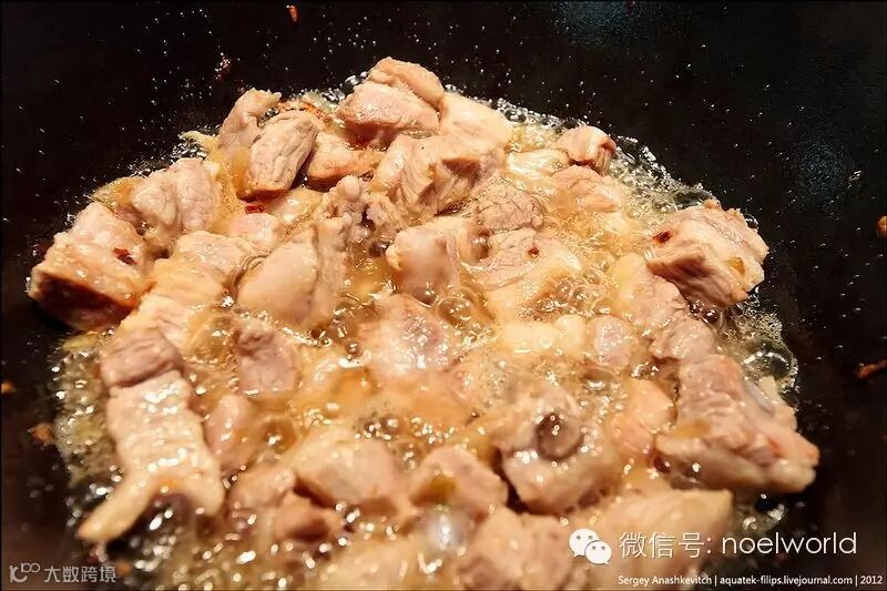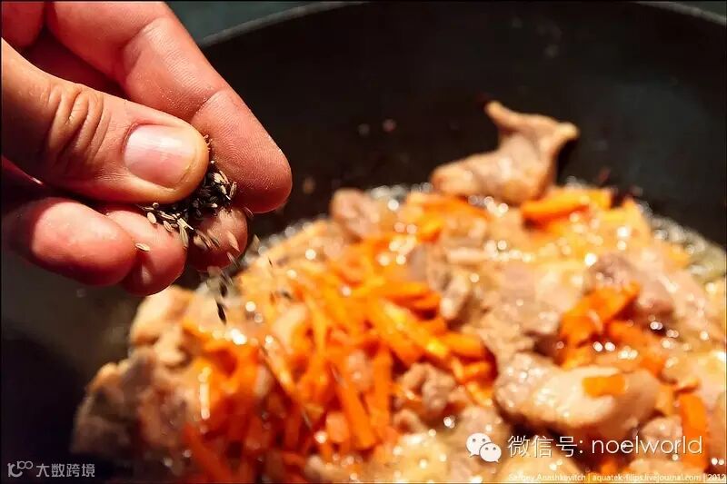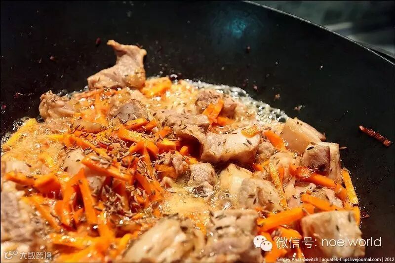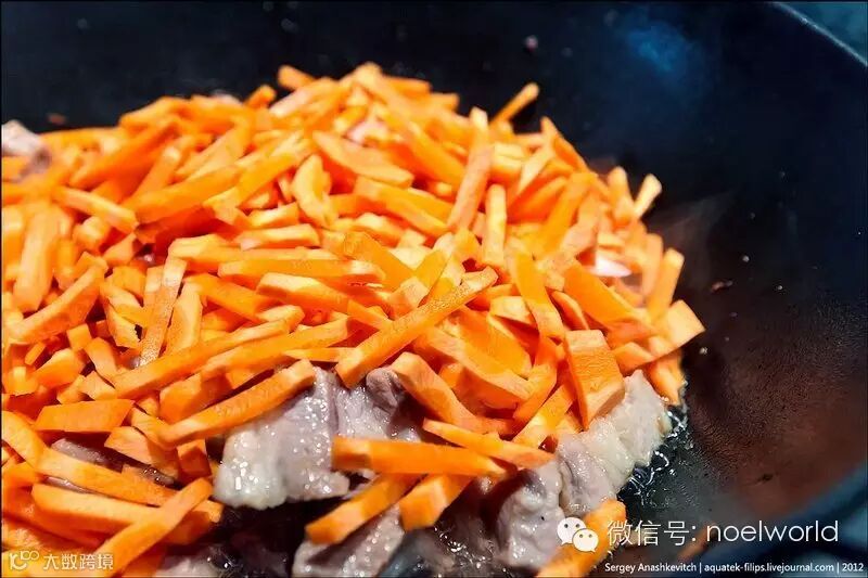 当肉片煸出香味变颜变色时,把切成细条的胡萝卜撒上去,加上胡椒面儿跟小茴香[适量]
