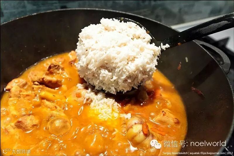 大米直接入汤,让汤没过米粒,然后中小火煮40分钟左右。这期间,注意查看防止糊锅,当水分蒸发得差不多时,用木铲翻起锅底的饭,反复搅拌,为的是入味和不会黏连。最后收干汤汁儿,装盘出锅!