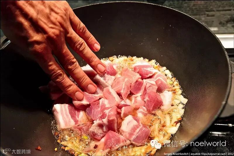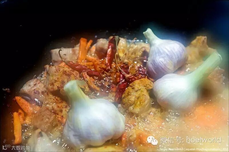 加入大蒜跟辣椒,俄罗斯的方式是不剥皮整颗大蒜放进去,我们做的话就根据我们的饮食习惯,将大蒜皮剥掉。然后,加入适量水跟盐,炖上一小时。