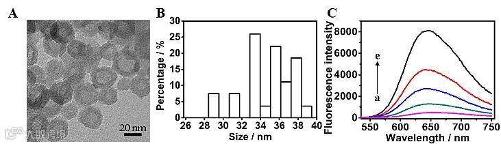 图2. Ru(bpy)3-SiO2@PDA的透射电镜(A)、粒径分布(B)和不同Ru(bpy)3掺杂量的荧光发射光谱(C)。