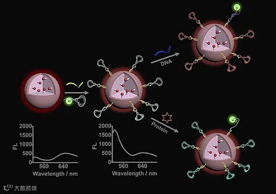 复杂样品中核酸和蛋白质的准确检测对于疾病的早期诊断和致病机理的研究均具有重要意义。近年来,荧光探针被广泛应用于核酸和蛋白质的检测。但是,依赖单一信号发展的荧光探针的荧光发射强度容易受到激发光稳定性和杂质光散射等因素的影响,在应用于尿液和血清等复杂样品的定量检测时具有一定的局限性。相比较而言,比率荧光探针基于两个波长下荧光强度的比值进行定量分析,自校准能力强,准确度更高。然而,目前可用于蛋白质和核酸检测的比率荧光探针的种类却非常有限。