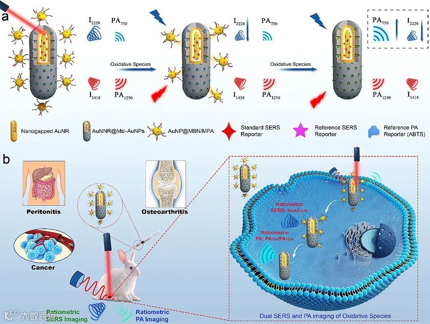 图1. 具有双比率型PA和SERS信号的核-卫星型的金纳米探针,用于高精度和实时地检测炎症、肿瘤和兔子膝骨关节炎中的H2O2。