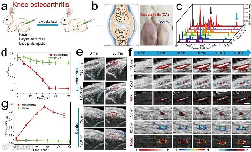 实验表明比率型的核-卫星探针具有优异的定量检测H2O2的能力,他们将其进一步用于小鼠的肿瘤模型、腹腔炎症模型以及兔子的膝骨关节炎模型中。在兔子膝关节炎模型的PA图像中可以清楚地识别出关节面、软骨和关节腔,注射后30 min,PA750/PA1250的比值信号增加了约3.4倍,H2O2浓度为91.89 ± 3.03 μM。在关节积液的SERS检测,2228 cm-1处SERS信号不断减小,而1418 cm-1处的SERS信号基本没有变化。结果表明,纳米探针与炎症区域过表达的内源性H2O2迅速反应,同时通过商业化的H2O2试剂盒验证了结果的准确性。