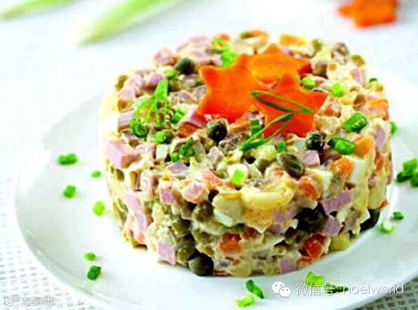 奥利维耶沙拉Оливье,在苏联时期最受欢迎的沙拉,简单好吃开胃。标准的苏式奥利维耶沙拉是以土豆为主,配上青豆和熟鸡蛋、熟香肠丁、腌黄瓜用沙拉酱拌制而成。