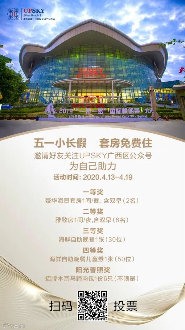 投票时间为:2020.4.13-19日,进入UPSKY广西区公众号导航栏—银滩一号—排行榜,即可查看。