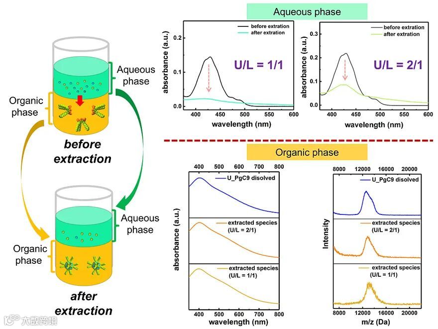 图2. 萃取分离前后水相/有机相中各物种的分析表征和监测