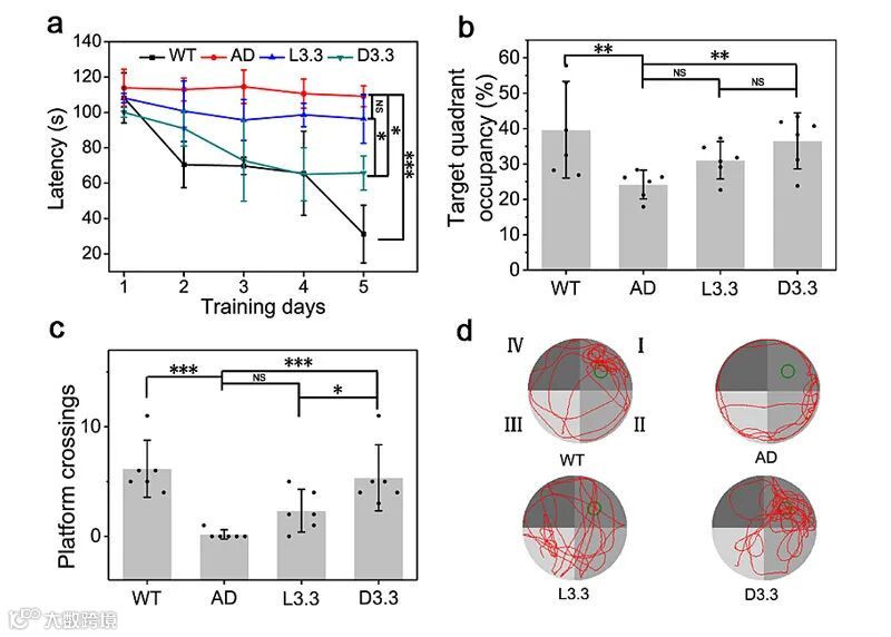 最后,研究人员对阿尔茨海默症模型小鼠进行每周一次共四周的给药后,进行了水迷宫实验以探究阿尔茨海默症模型小鼠的行为学变化(图2)。实验结果表明未给药的阿尔茨海默症模型小鼠经过五天平台的学习训练后,第六天(寻找平台)在目标象限花费的时间最短,穿越平台次数最少,并且运动轨迹仍然是“边缘型”,这些结果说明阿尔茨海默症模型小鼠的学习和记忆功能严重下降。L3.3给药组相对于未给药组,其行为学在统计学上没有显著变化。而D3.3给药组的阿尔茨海默症模型鼠表现出更短的潜伏期,其在目标象限寻找的时间和穿越平台的次数都明显增加,并且运动轨迹为“趋向式”,这些结果表明D3.3显著地改善了阿尔茨海默症模型小鼠的记忆缺陷。