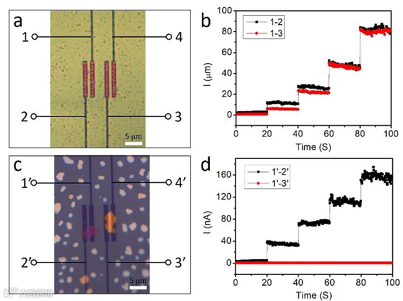 图2. 不同方法制作TES-ADT有机半导体OFET显微镜照片与近邻OFET器件串扰测试(a)、(b)室温生长连续薄膜和(c)、(d)选区生长后溶剂蒸汽退火形成单晶。
