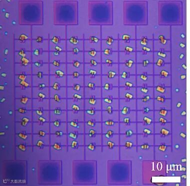 研究人员采用的先限位选区生长再原位晶化的方法与光刻技术完全兼容,可制备大面积有序微米尺寸的有机单晶阵列。得益于选区生长的位置精确控制及后期SVA微扰动处理,所得各分立有机单晶之间是完全分立的,这完全避免了器件间的相互串扰(cross-talk)问题(图2)。实验表明,通过表面结构优化设计可以控制半导体分子自对准生长在微电极对区域,从而避免了寻址线对晶体位置的影响(图3)。该方法可直接用于高密度有机晶体管阵列和基本逻辑门电路等制作,为高集成度有机电路的开发打下基础。