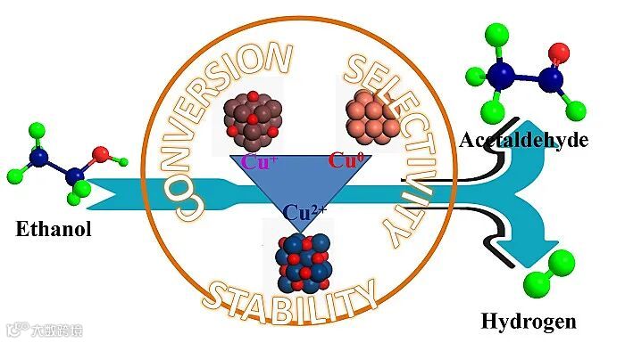 此外,研究发现铜与MFI基体存在强相互作用,具有丰富的Cu-O-Si键,其能稳定界面上的一价铜和零价铜。因此,通过二价铜、一价铜和零价铜的协同作用,实现了乙醇高活性转化为乙醛,并保持催化剂性能的高稳定性(图2)。