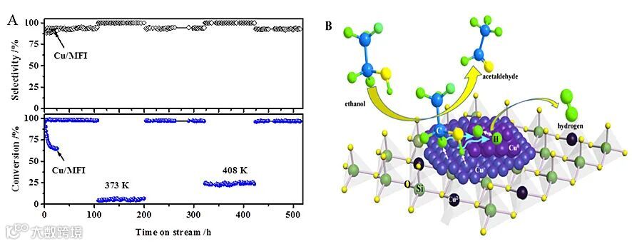 图1. (A) Cu-MFI催化剂上乙醇转化率和乙醛选择性随时间的变化结果 (523 K, WHSV=0.53 h-1);(B) 乙醇脱氢的反应机理示意图。