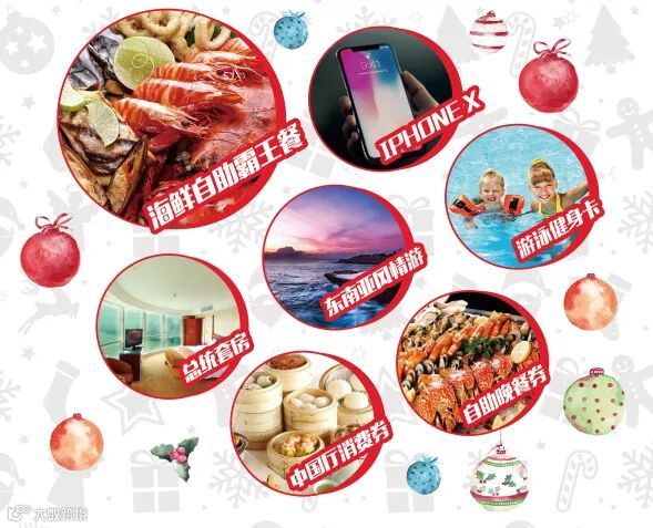 平安夜还有各种好礼送不停,西餐厅海鲜自助霸王餐、IPHONE X手机、东南亚风情游、总统套房、游泳健身卡、中国厅消费券……60%的中奖率,好礼都在这里,就等您的到来!