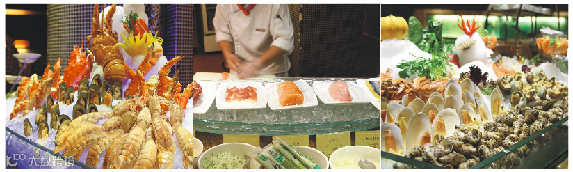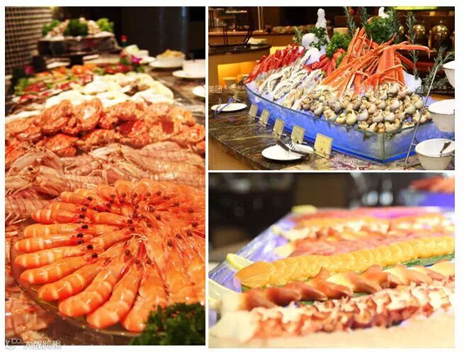 海鲜刺身区新增了一批重量级成员:龙虾、阿拉斯加蟹脚、北极贝、皇帝蟹,香螺、濑尿虾加上老朋友挪威三文鱼、金枪鱼、鲷鱼和八爪鱼、扇贝、生蚝等,绝对最新鲜。