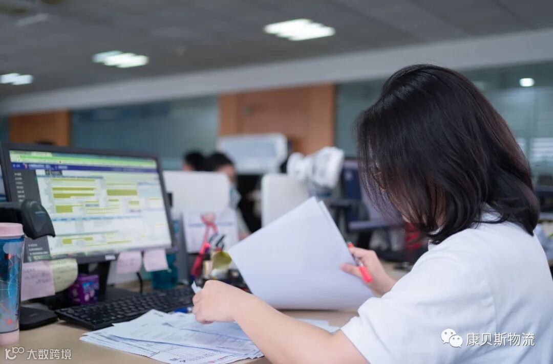 在办公室里,康贝斯的员工们穿着统一的工作制服,有的同事正严谨地核对每一票报关单,在提升报关时效的同时也确保报关数据的准确性;有的同事在把关每一批货物准确及时提送到客户工厂。