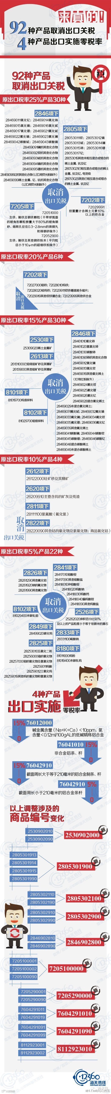 5月1日过后,一大波新政开始实施,其中“海关总署公告2015年第16号”对部分产品出口关税进行了调整:包括对92种产品取消出口关税、对4种产品出口实施零税率,同时还公布了调整涉及的海关商品编号变化情况。往下拉↓看详情↓