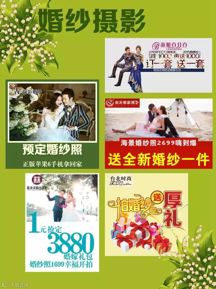 婚纱摄影:新娘百分百充1元抵千元,订一套再送一套;古摄影送正版苹果6手机;索菲雅送全新婚纱;喜洋洋1699幸福开拍;台北时尚海景婚纱照2088元