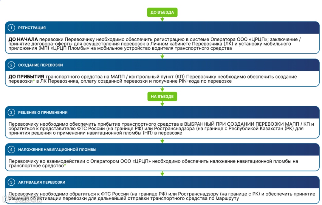 公路运输承运人向俄罗斯境内运输货物时,需提前在数字平台发展中心(ЦРЦП)系统中注册,通过个人账户支付运营商服务费用并填报运输信息。入境时需在边境检查站完成铅封施封与激活,铅封将在全程运输中使用,直至运抵终点或离开联盟国家出境检查站。